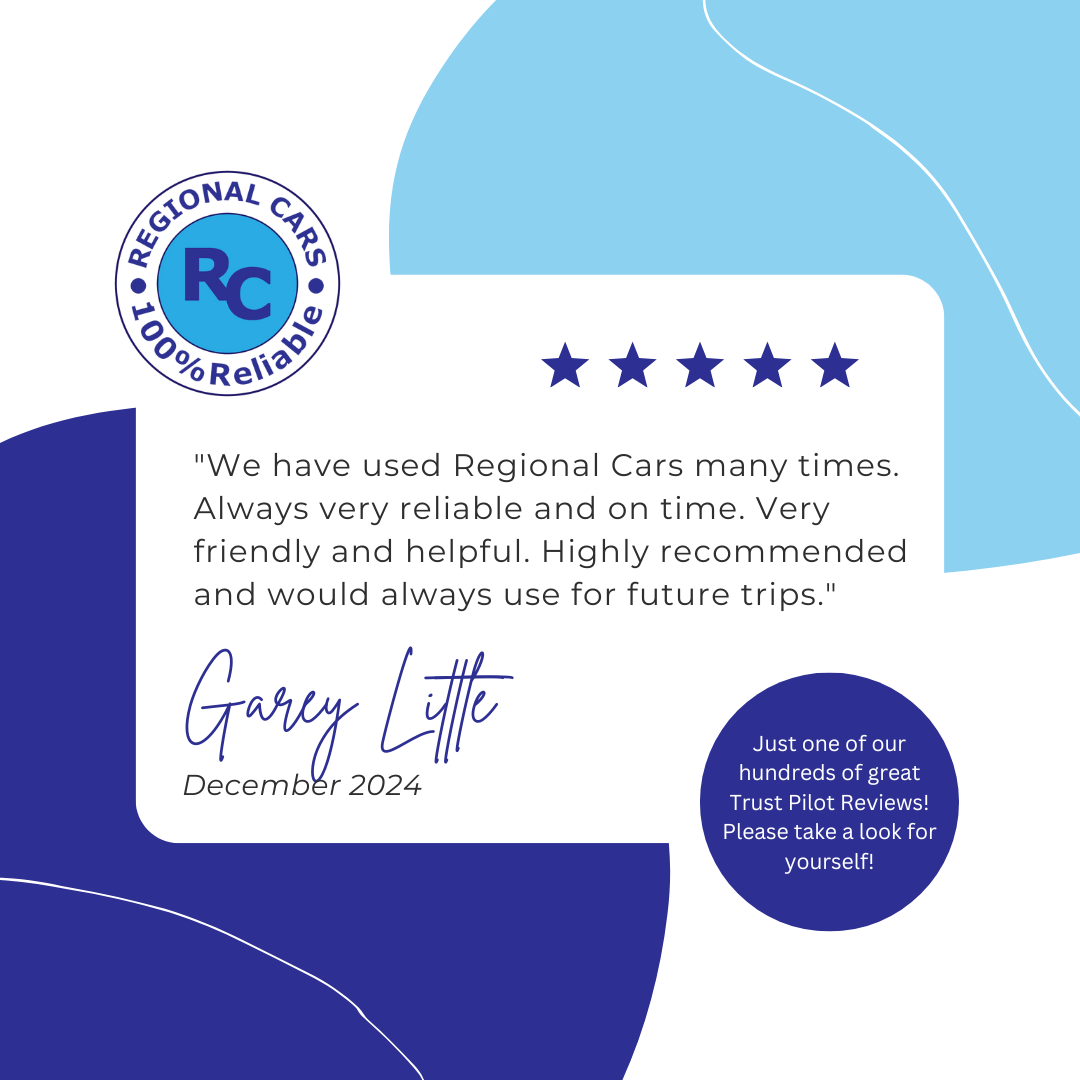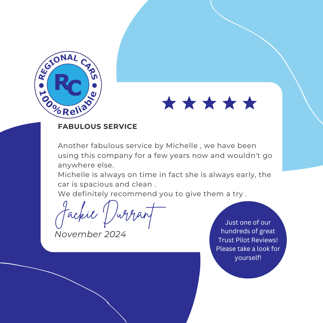 Professional, punctual and efficient airport transfer service from Regional Cars. Very smooth journey in a comfortable car. I will definitely use Michelle again and will recommend to others.